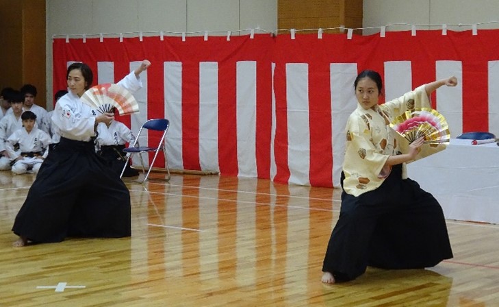 Before the matches, the performance of YUSHINMON BUKE-MAI by two women highlighted strength and flexibility, offering a gallant, beautiful, and splendid start.