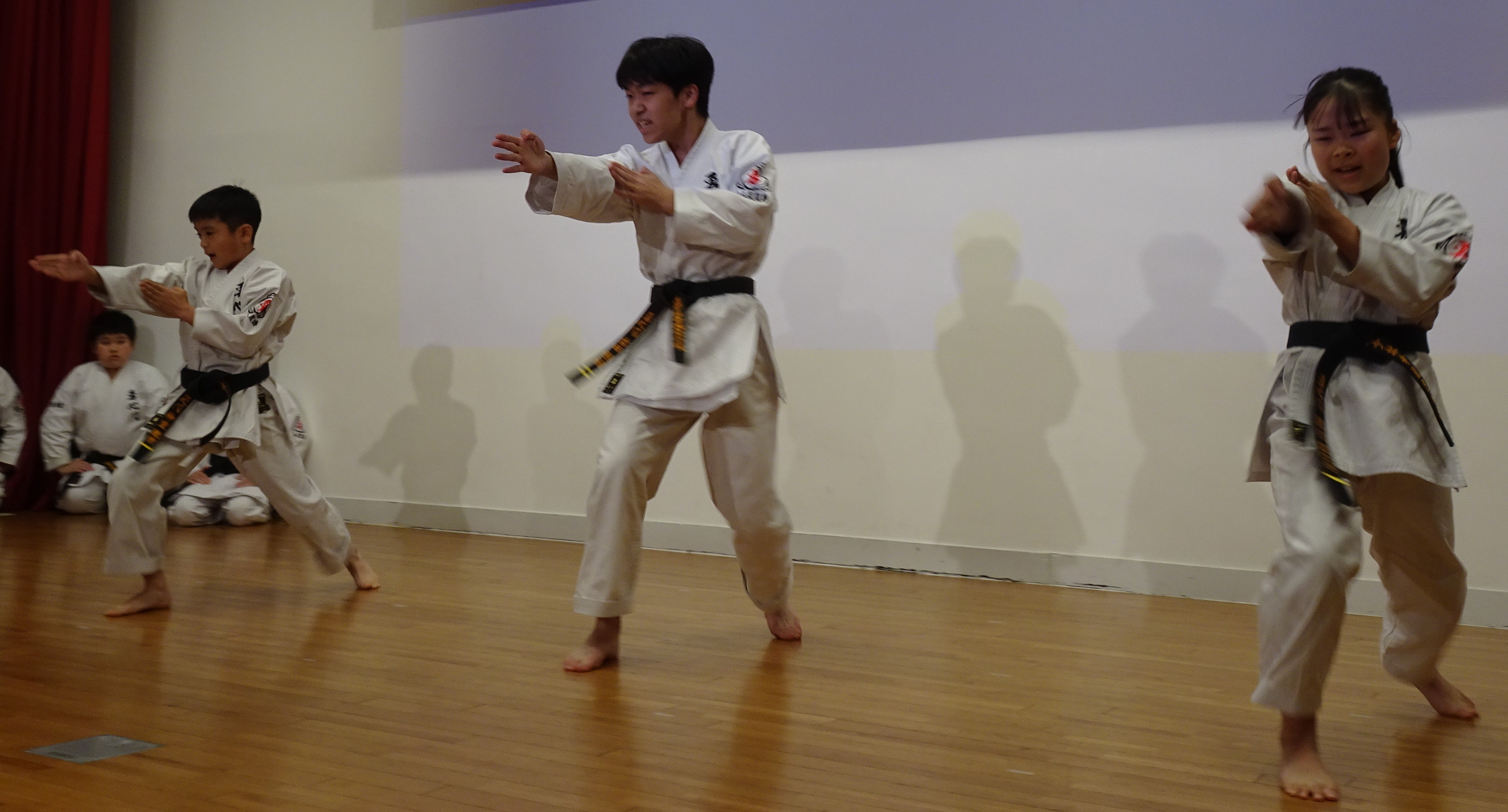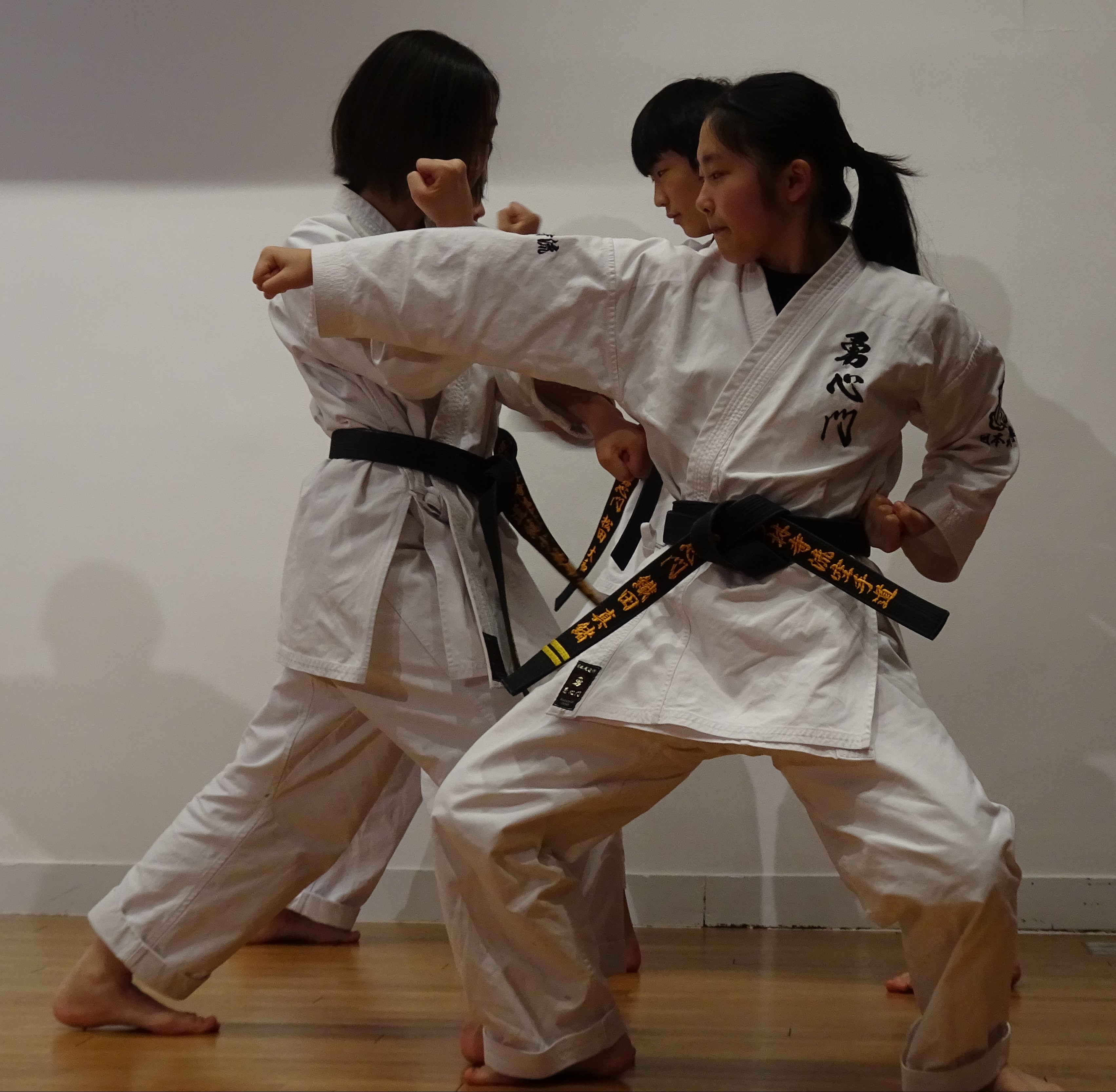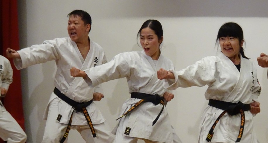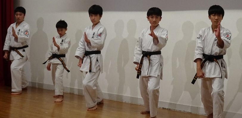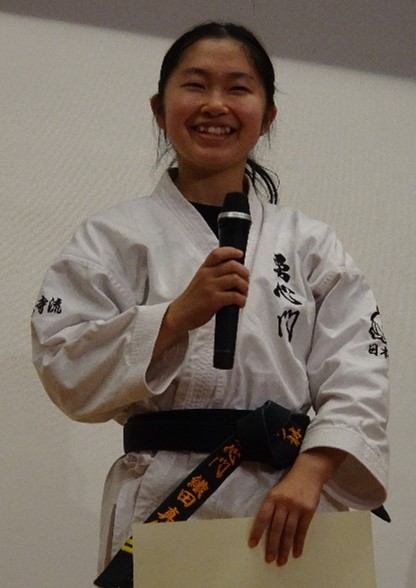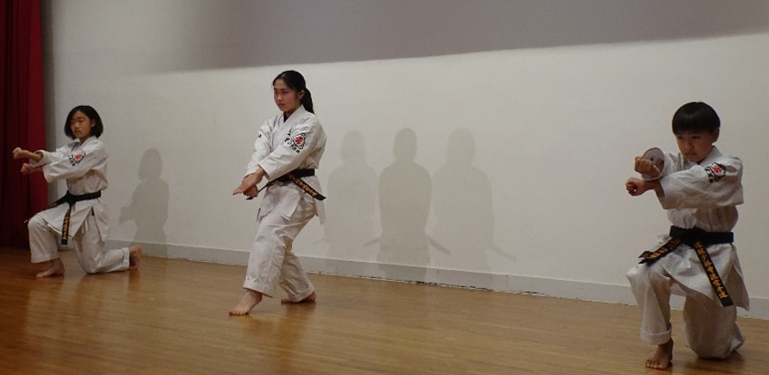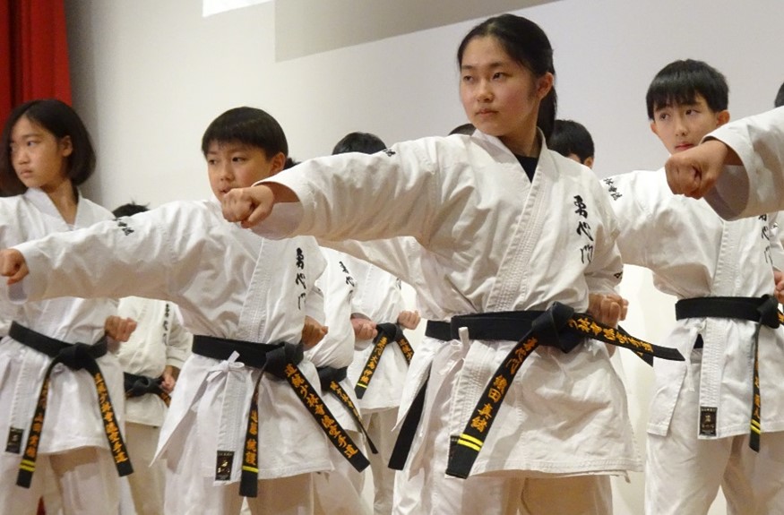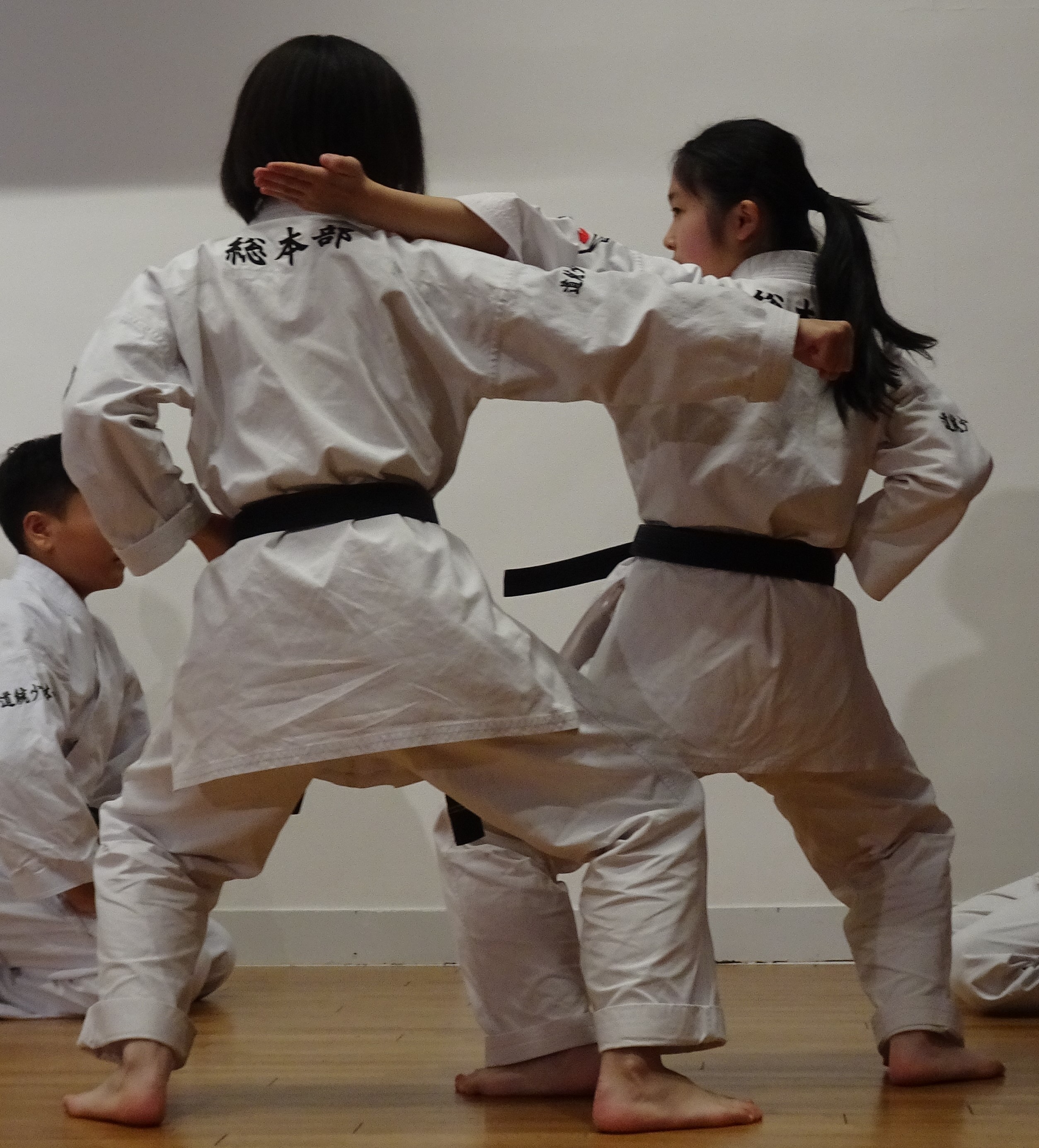BASSAI and GOJUSHIHO by middle school students BASSAI by ODA Mao 2nd Dan (center) GOJUSHIHO by YAMADA Miho 2nd Dan (left), ENDO Togo 1st Dan (right)