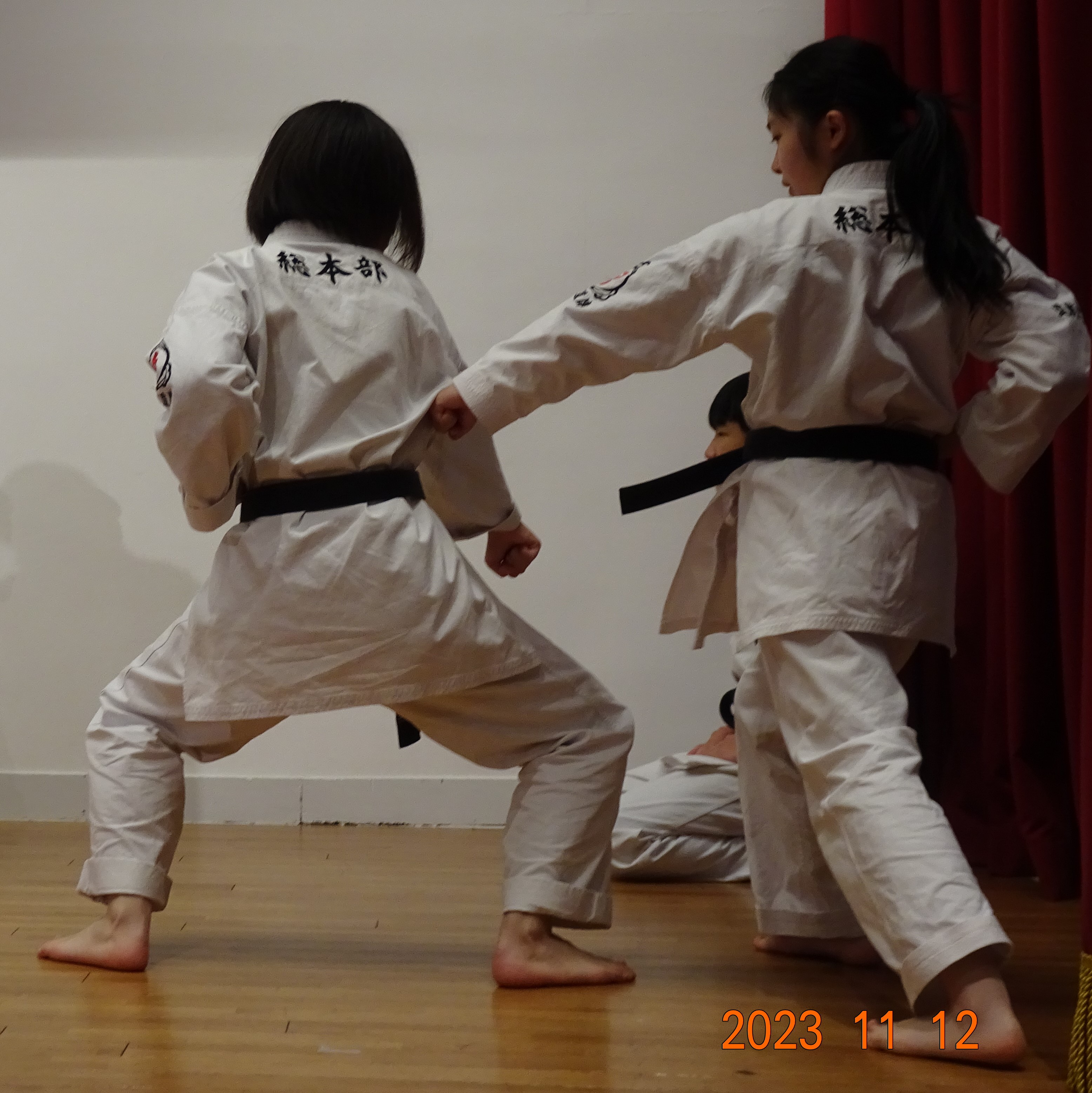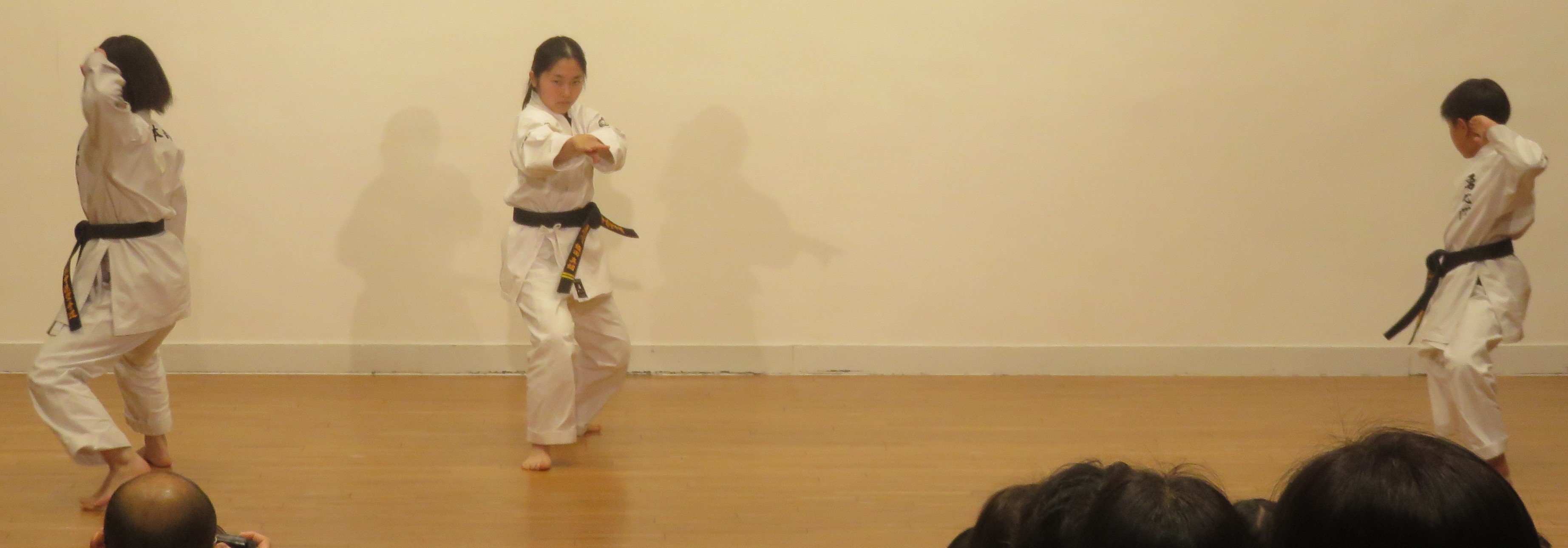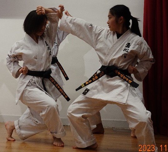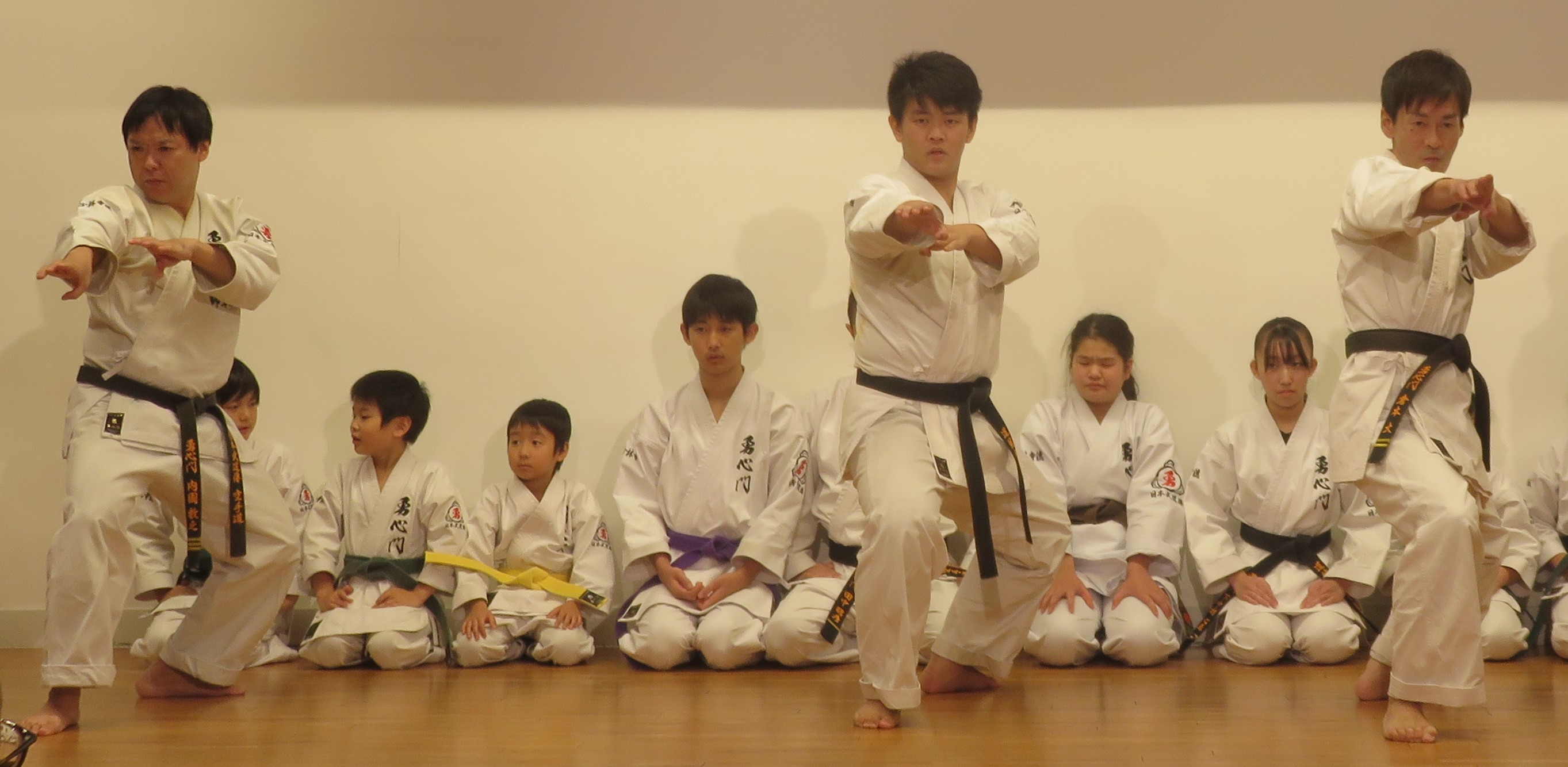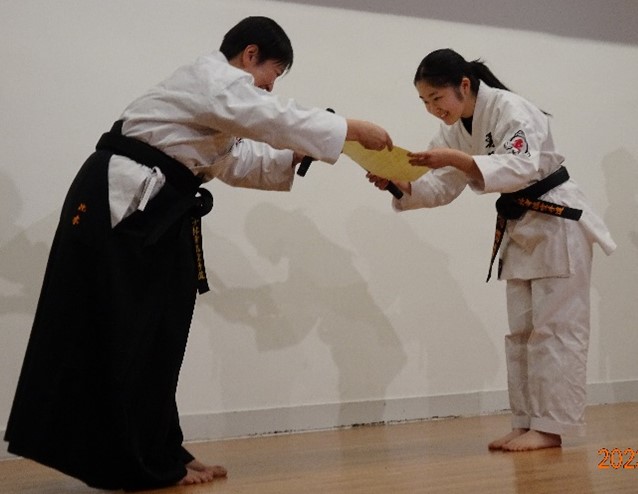 BASSAI and GOJUSHIHO by middle school students BASSAI by ODA Mao 2nd Dan (center) GOJUSHIHO by YAMADA Miho 2nd Dan (left), ENDO Togo 1st Dan (right)