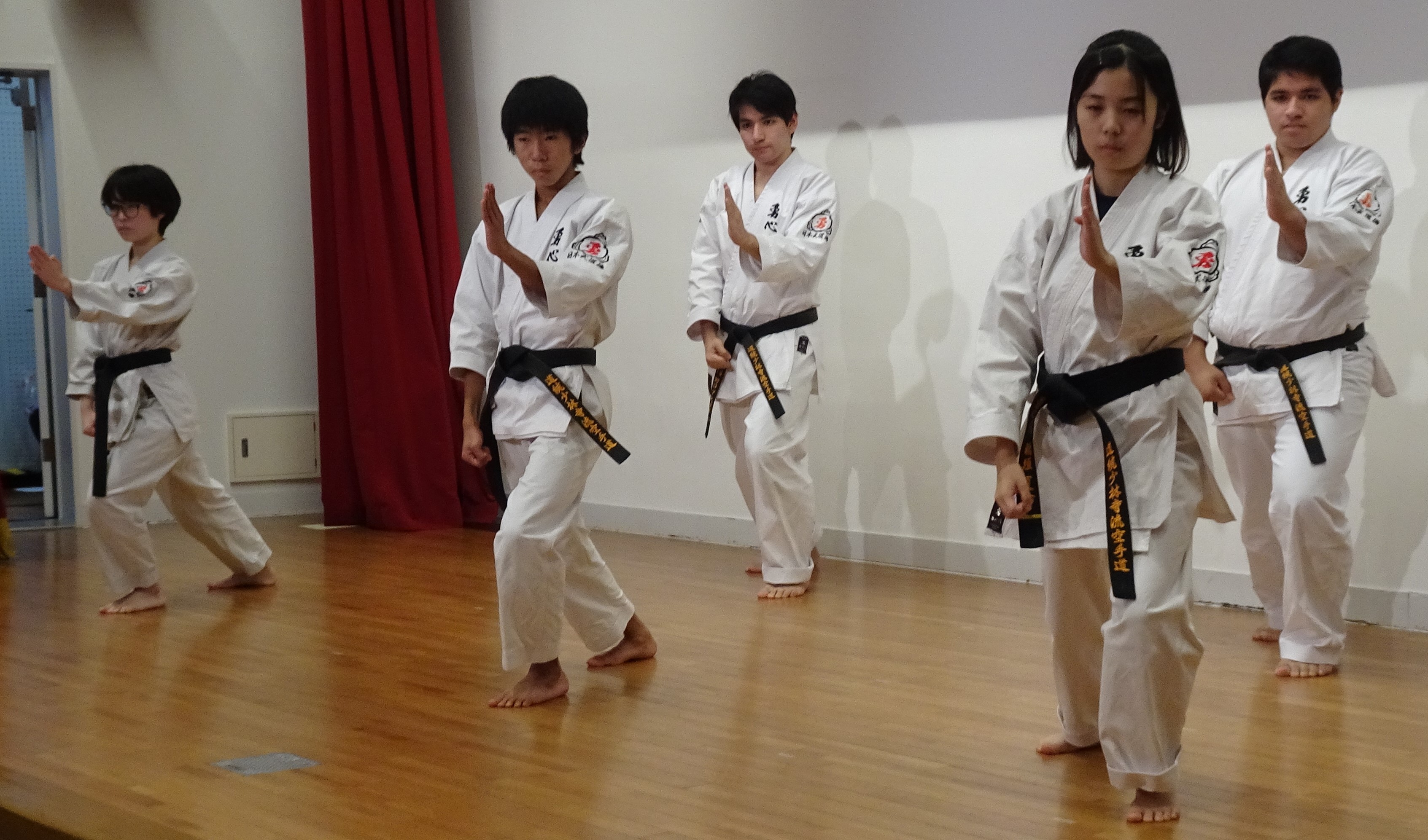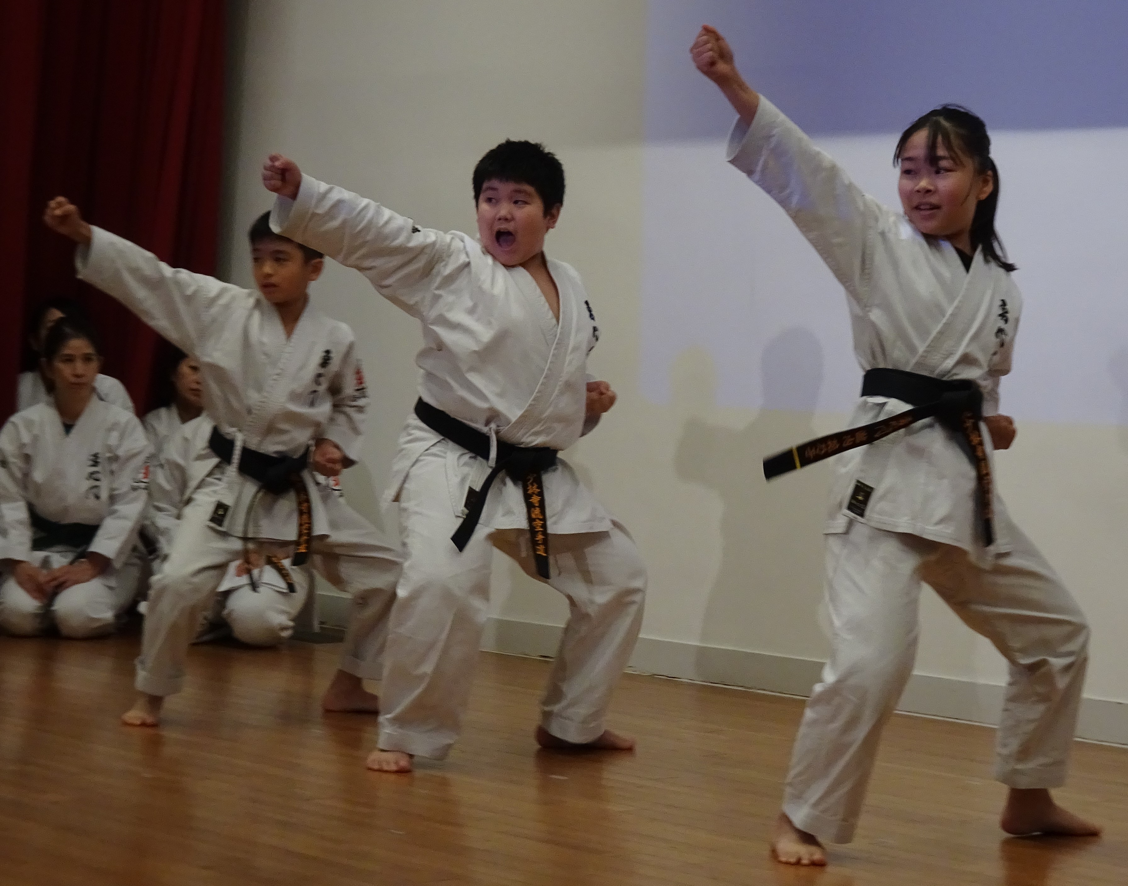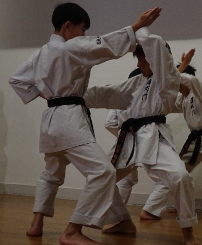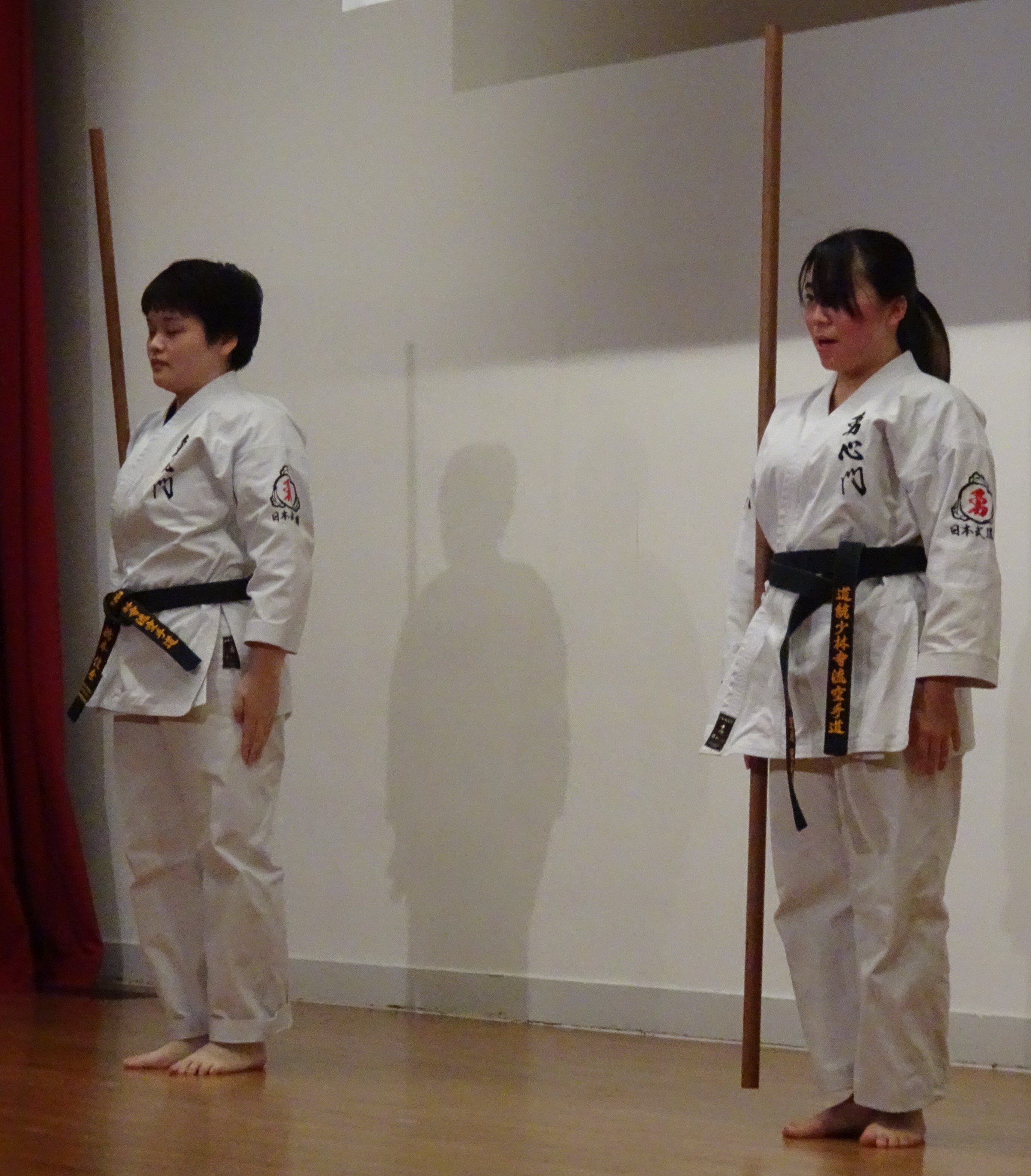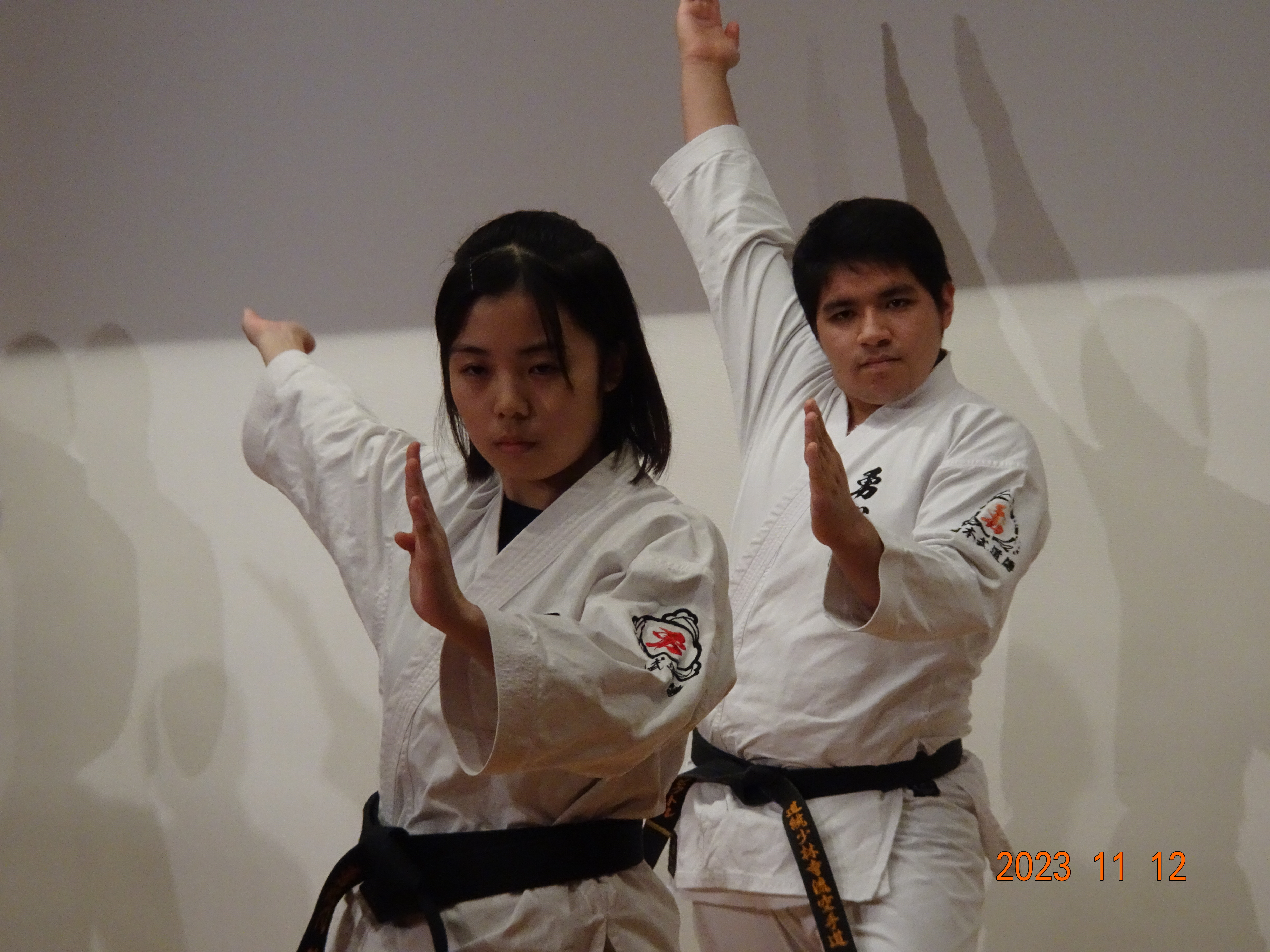 BASSAI and GOJUSHIHO by middle school students BASSAI by ODA Mao 2nd Dan (center) GOJUSHIHO by YAMADA Miho 2nd Dan (left), ENDO Togo 1st Dan (right)
