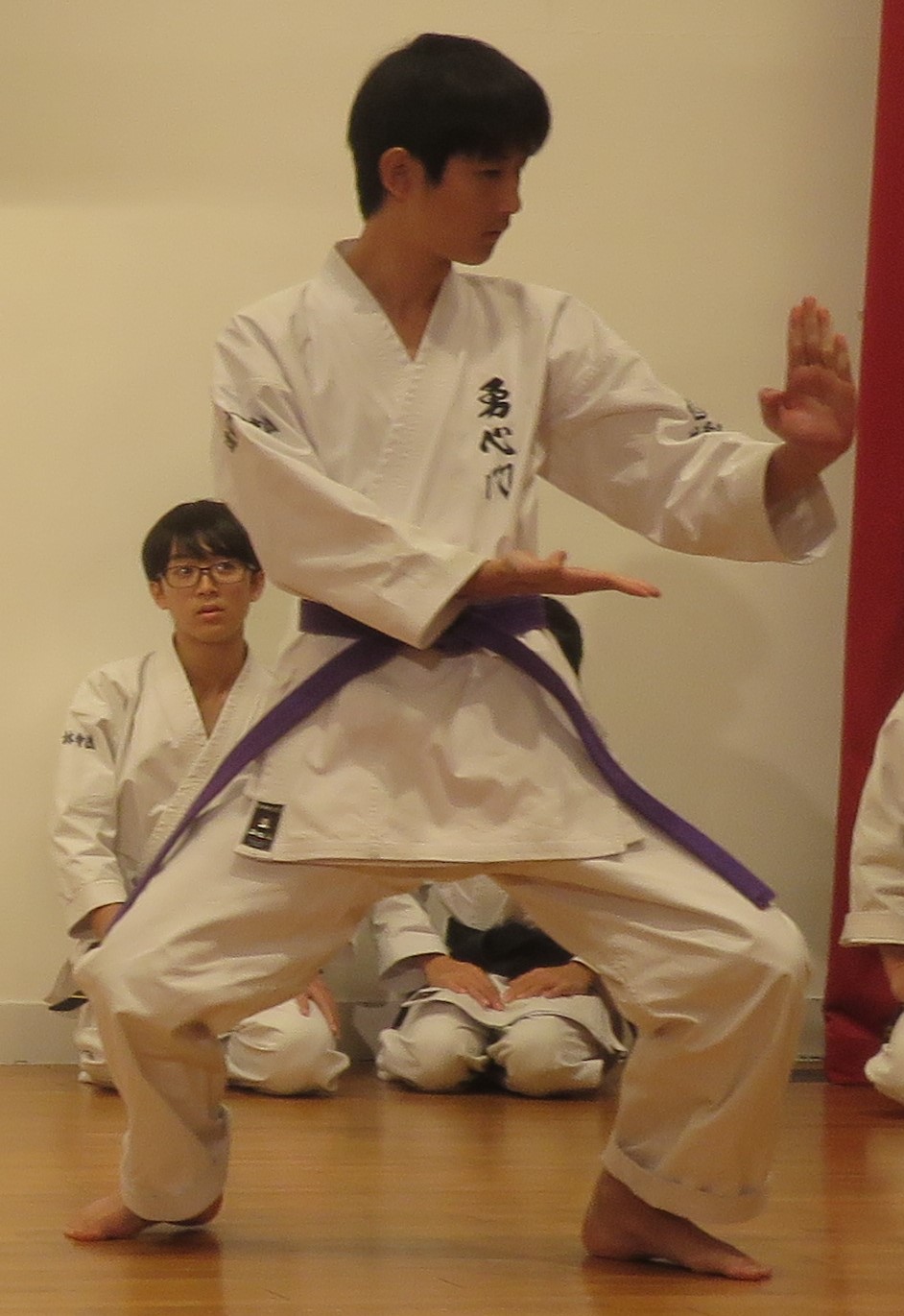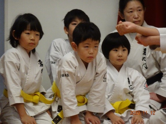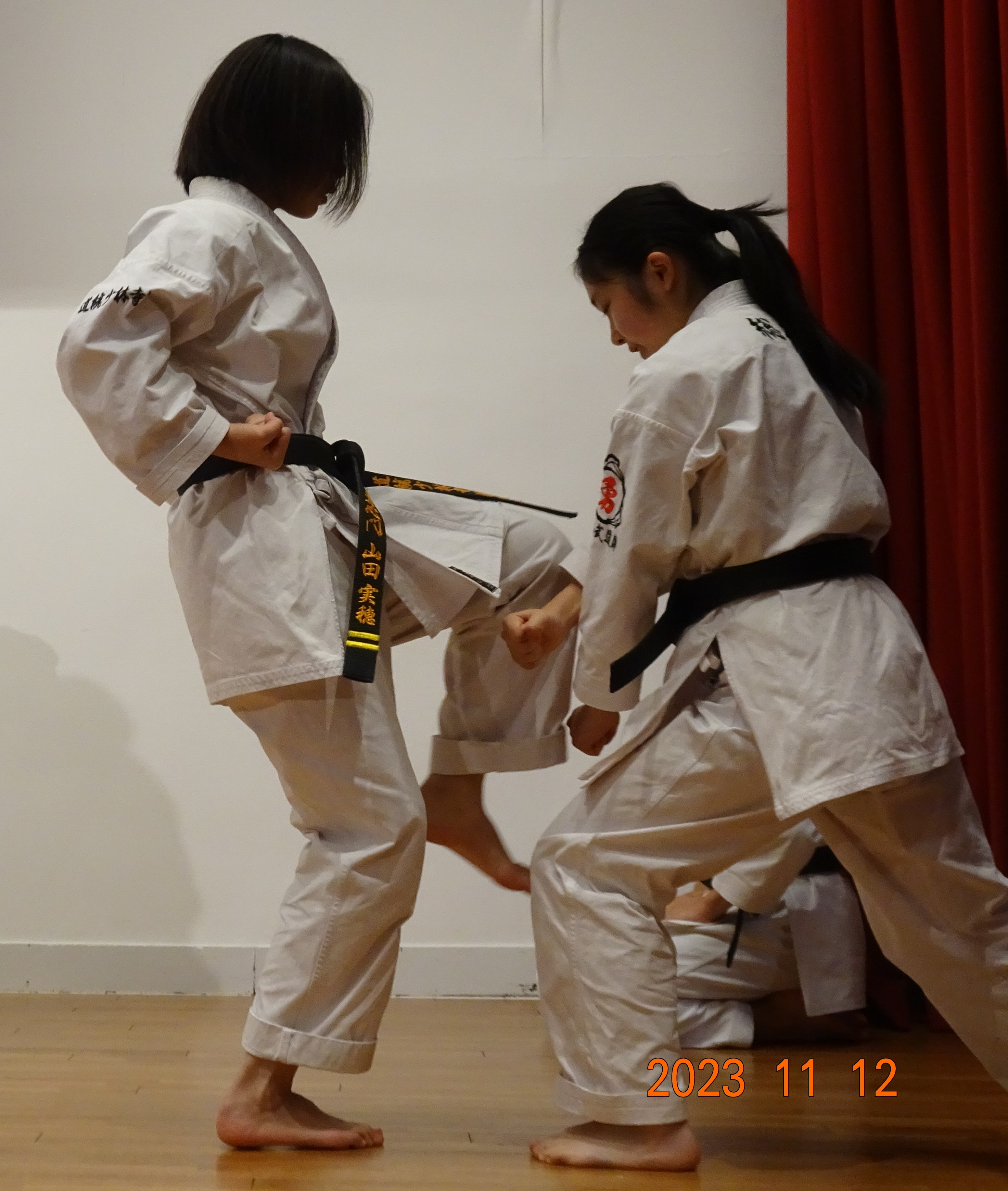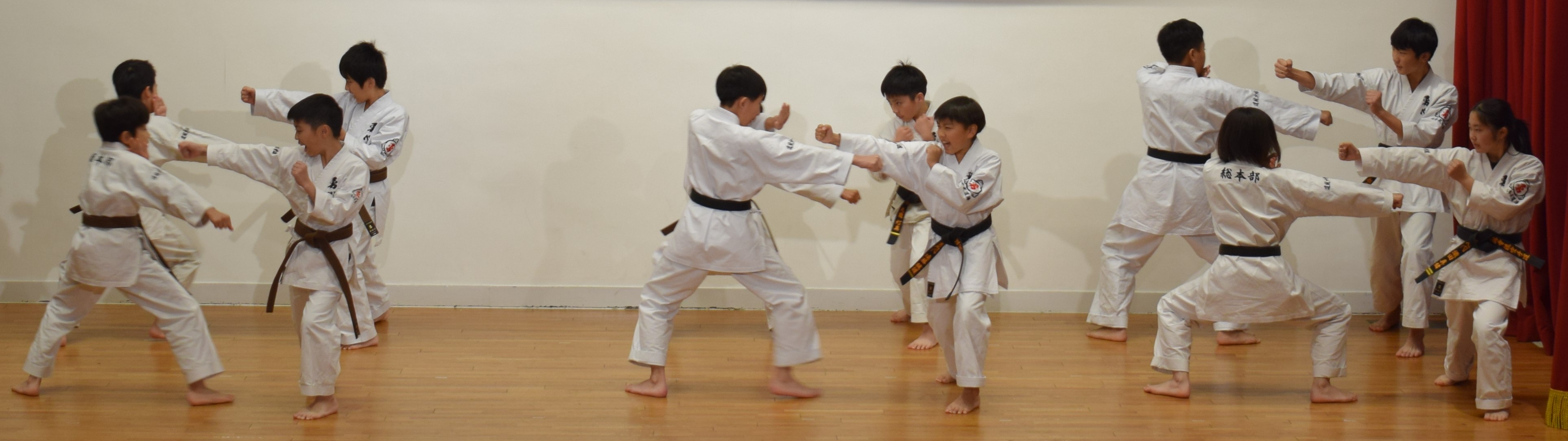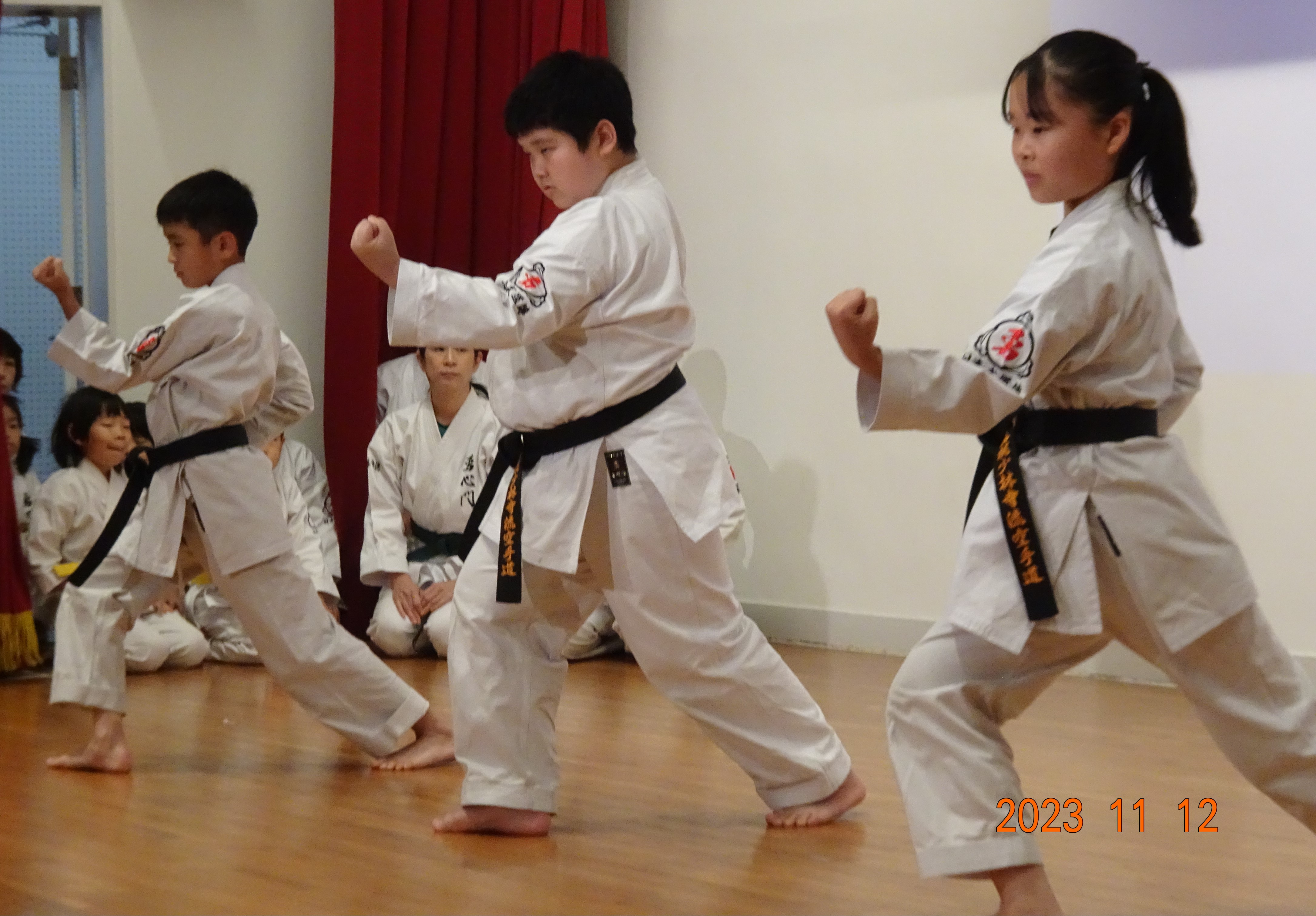 BASSAI and GOJUSHIHO by middle school students BASSAI by ODA Mao 2nd Dan (center) GOJUSHIHO by YAMADA Miho 2nd Dan (left), ENDO Togo 1st Dan (right)